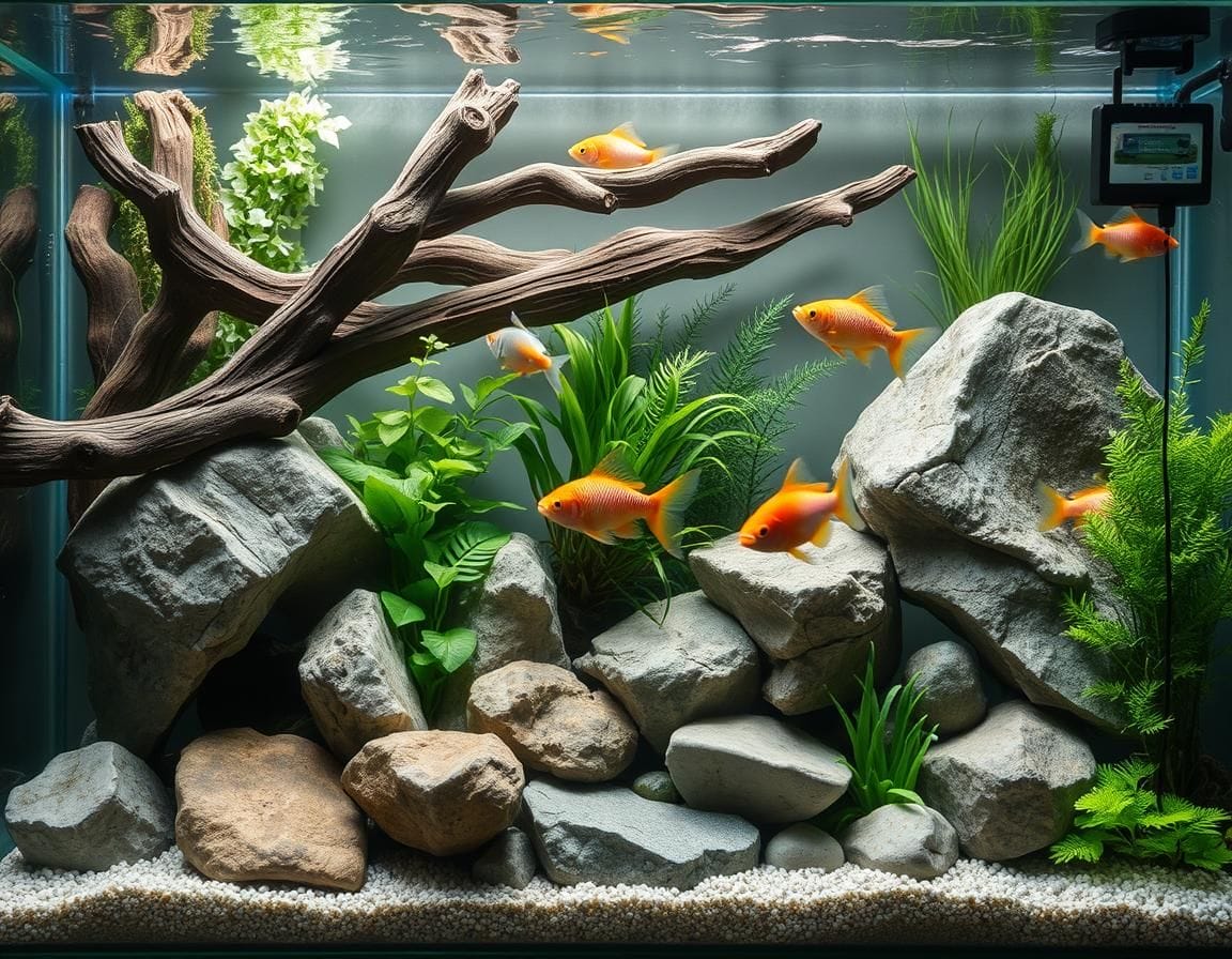 Plan your layout to balance hiding spaces and open areas. This layout creates a harmonious setting, making fish feel safe and at home.
