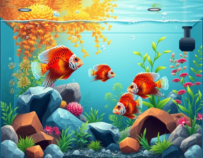 How you set up the aquarium matters. It affects your Flowerhorn’s comfort and interaction. Consider these tips: